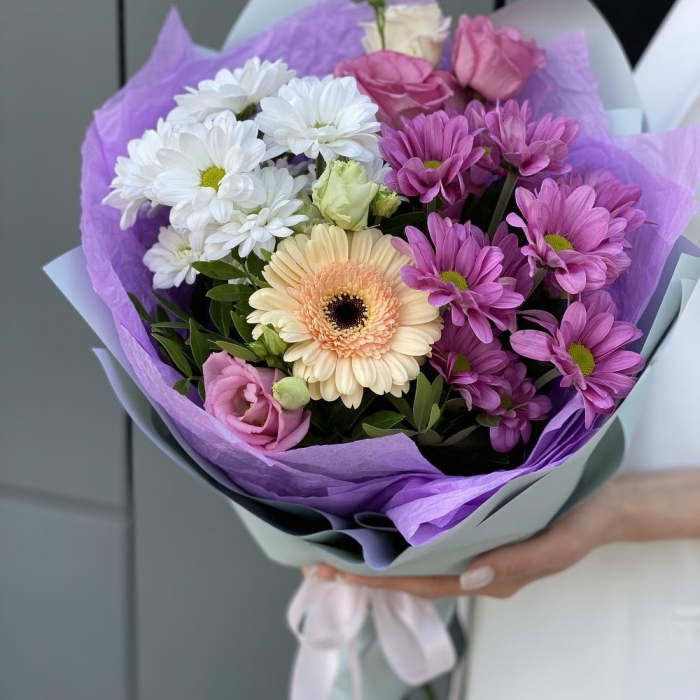 Небольшой, но милый букет из герберы, 2 кустовых хризантем и 2 веточек эустомы.