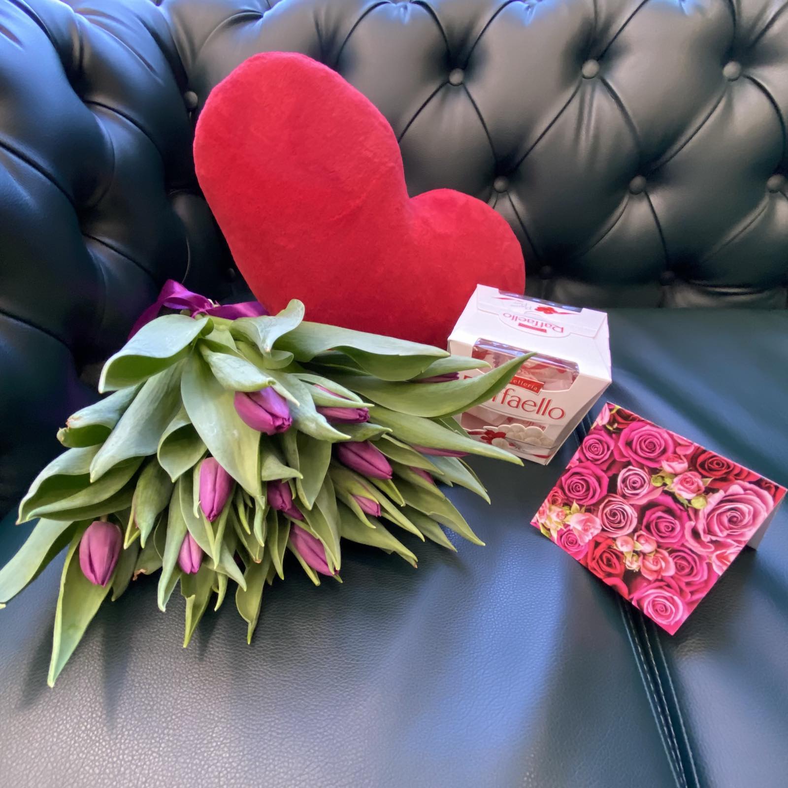 ГлавнаяЦветыТюльпаны Подарочный набор «Весенний» сиреневые тюльпаны + сердце