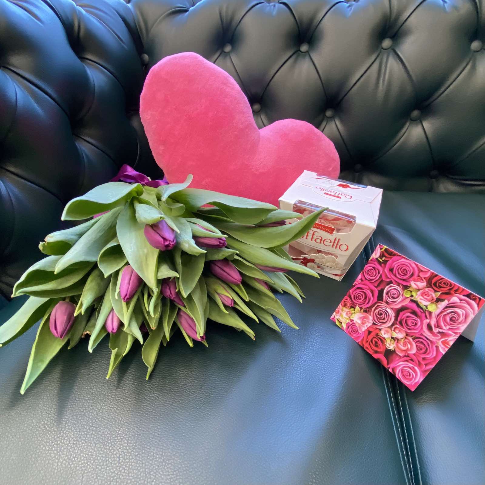 Подарочный набор «Весенний» сиреневые тюльпаны + розовое сердце