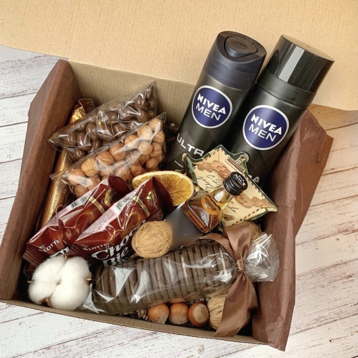 Состав: антиперспирант, пена для бритья, орехи в шоколаде, печенье Чокопай, фундук, батончик Твикс, печенье Орео, мини виски, декор, упаковка подарка.