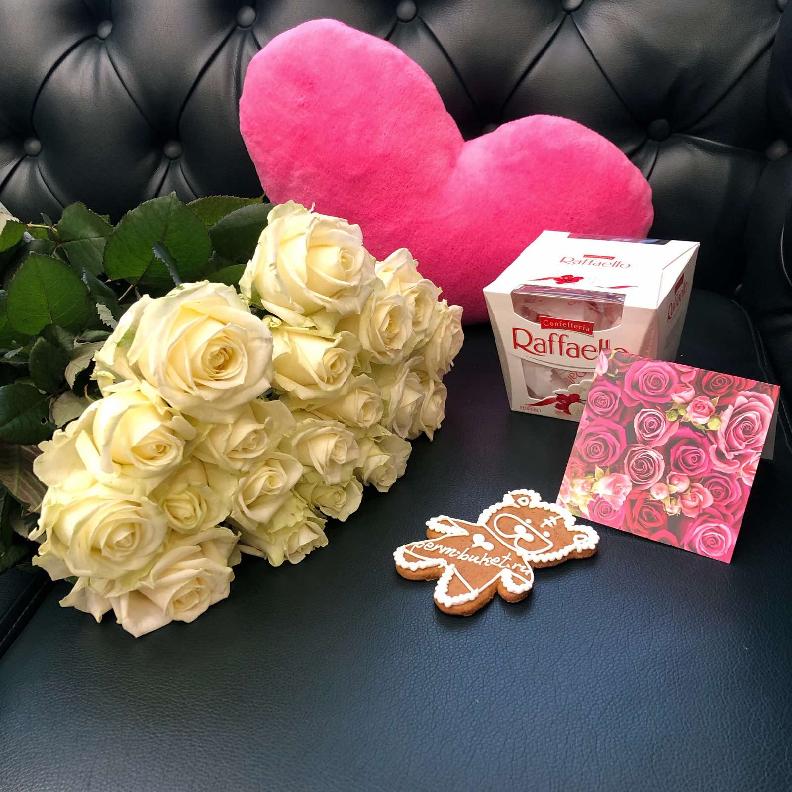 ГлавнаяБукетыБукеты из роз Подарочный набор «От сердца» белые розы + розовое сердце + конфеты