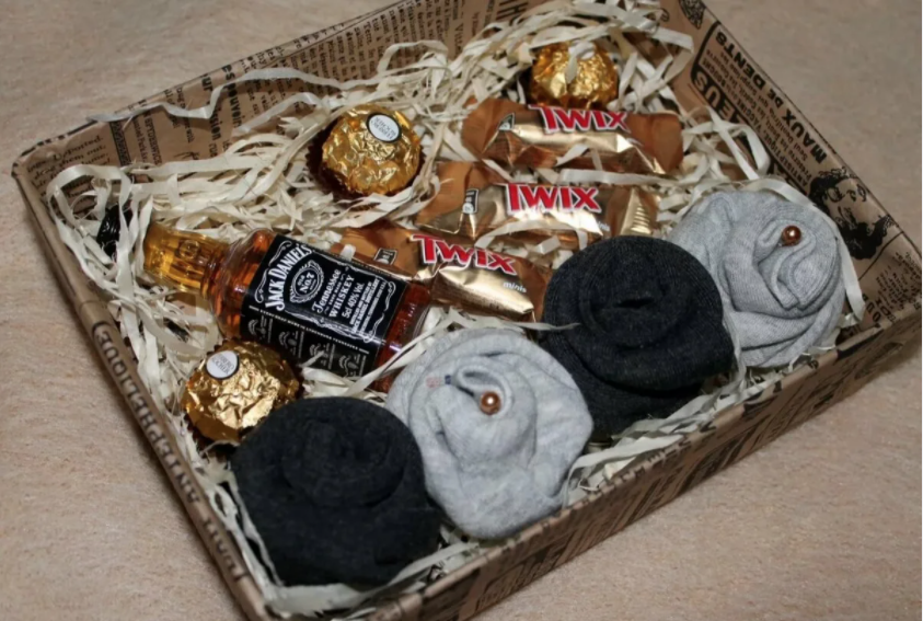 Состав: Маленькая бутылочка виски, 2 пары носочков и конфетки.