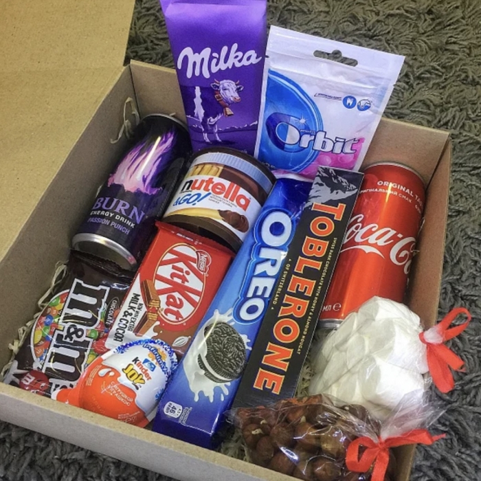 Kinder, Драже M&M’s, Молочный шоколад Milka, Печенье Oreo, Батончик шоколадный Nestle KitKat, Орешки фундук, Зефир 50г., Жевательная резинка Orbit Bubblemint, Coca cola 0,33л.  Энергетик Burn, Швейцарский шоколад Tableronne 100г.