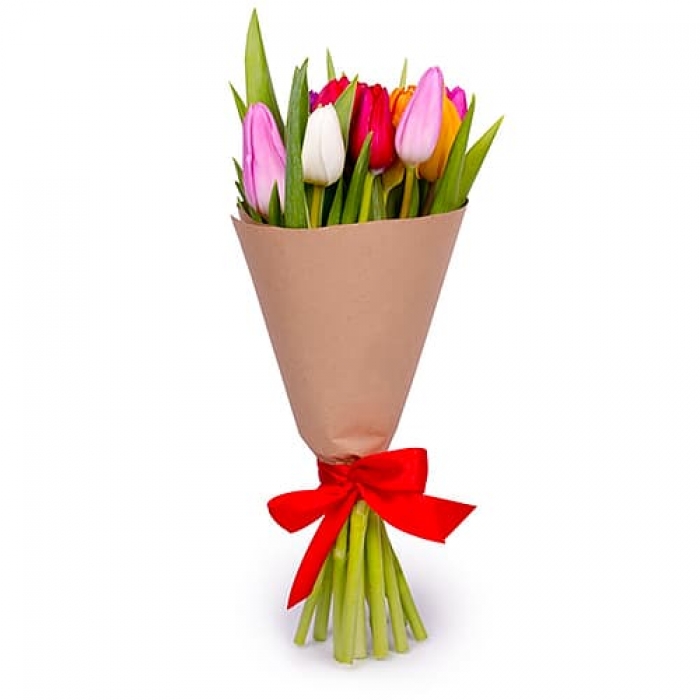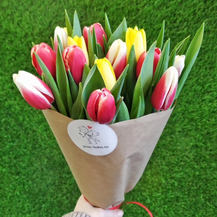 Отличный весенний крафт-букет из 15 тюльпанов в стильном оформлении (цвет может отличаться)