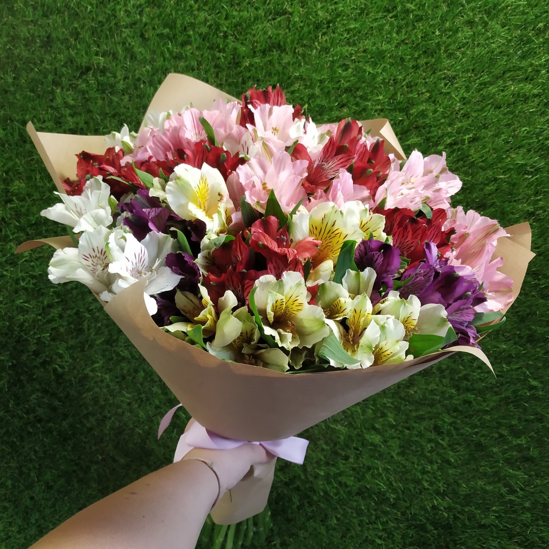 ГлавнаяЦветыАльстромерии Акция!!! Букет из 25 разноцветных альстромерий в крафте
