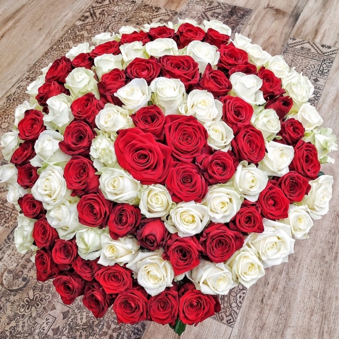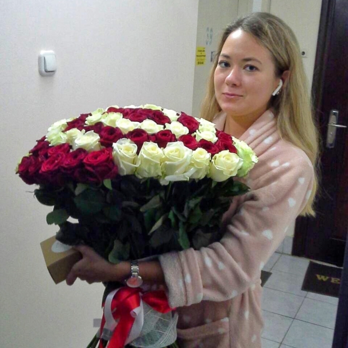 Невероятный, притягивающий к себе внимание букет из 101 розы сорта Гран При, Аваланш