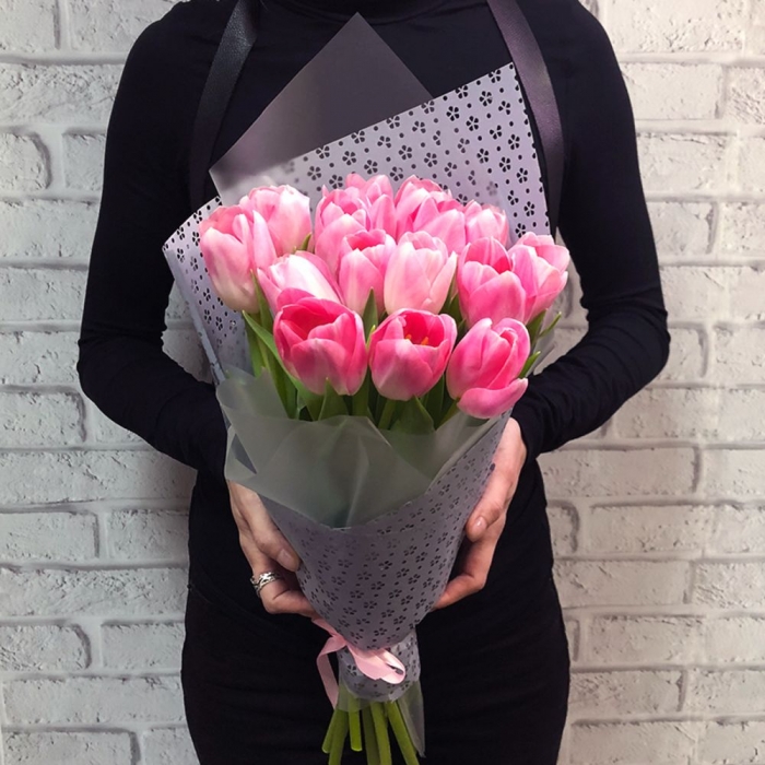 Букет из 15 розовых тюльпанов в красивом оформлении