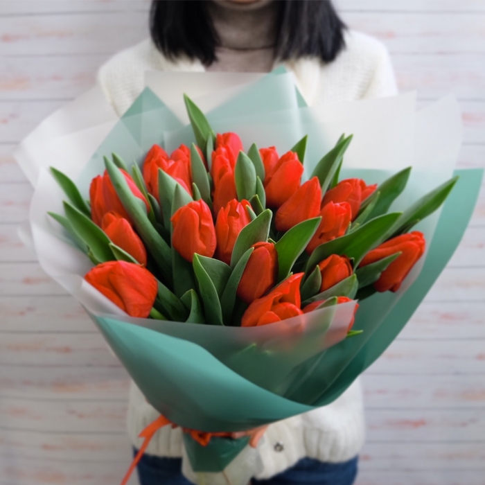Букет из 15 рыжих тюльпанов в красивом оформлении.