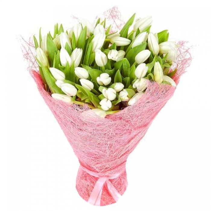 ГлавнаяЦветыТюльпаны Букет из 25 белых тюльпанов + Пряник