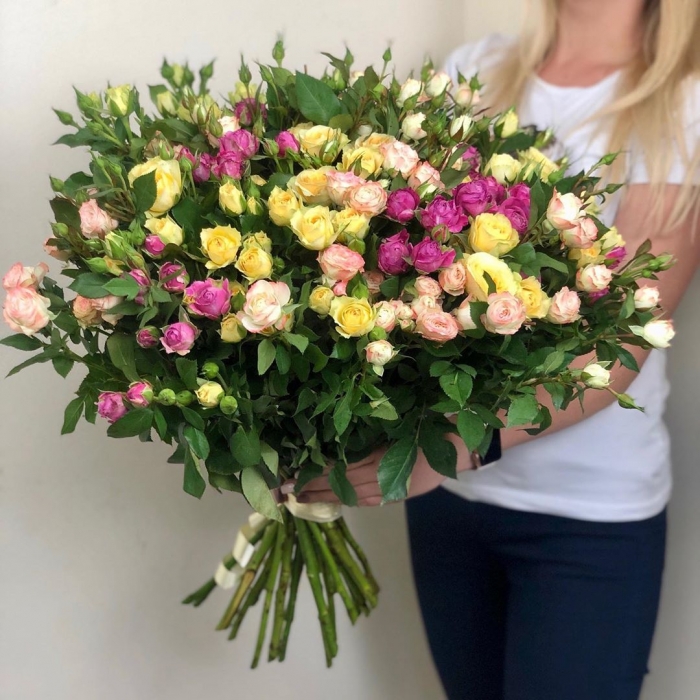 Букет состоит из 25 разноцветных кустовых роз. Оформление лента