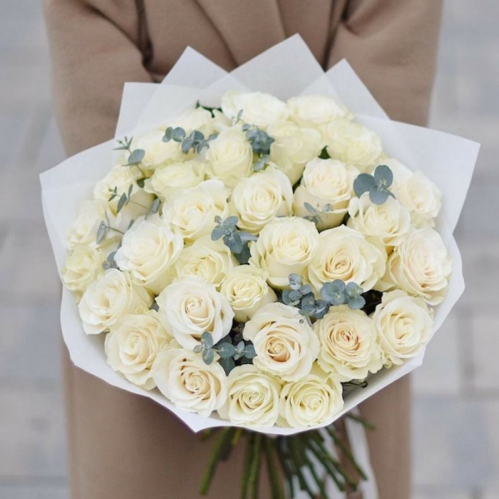 Букет из 31 белой розы 70 см и эвкалипта в нежном оформлении