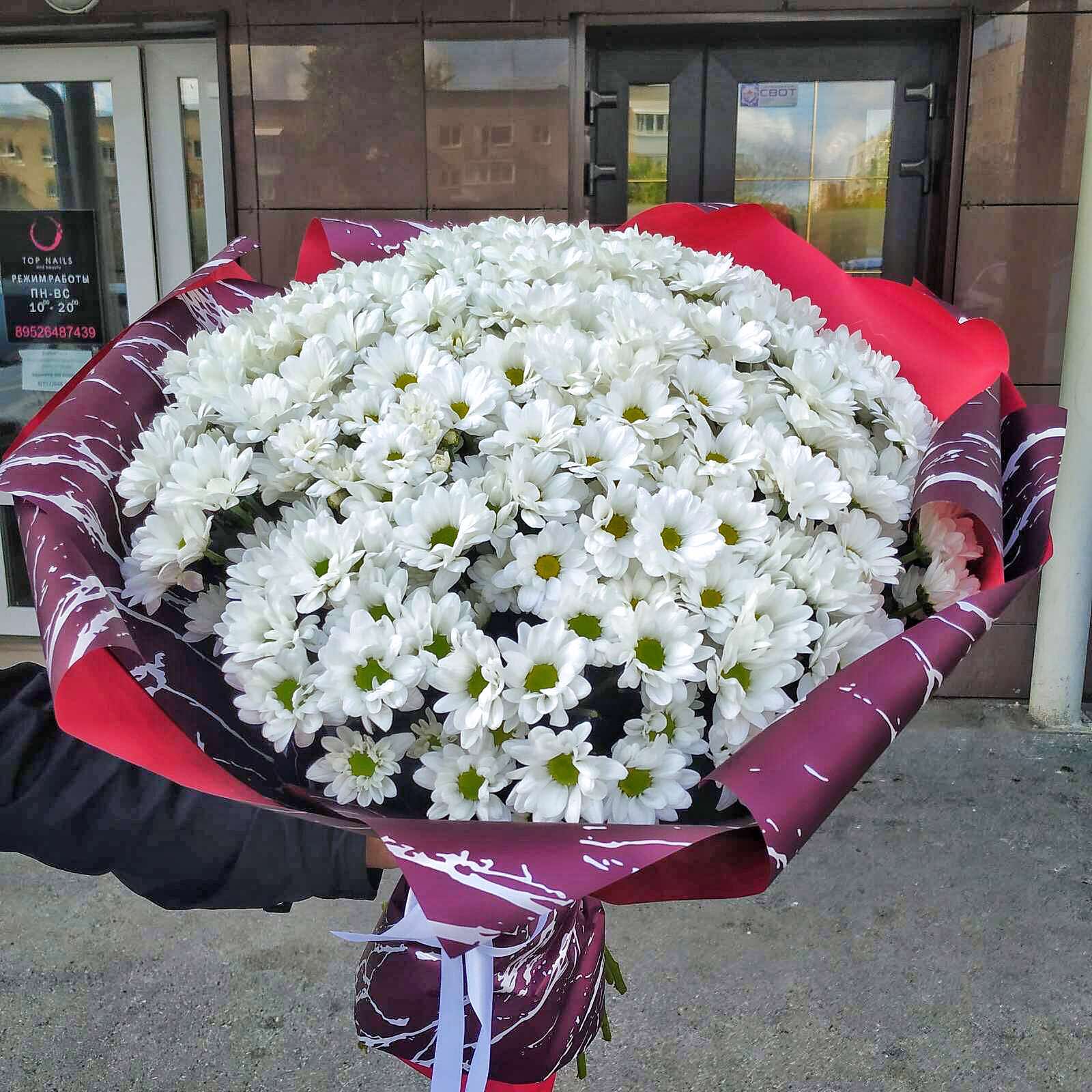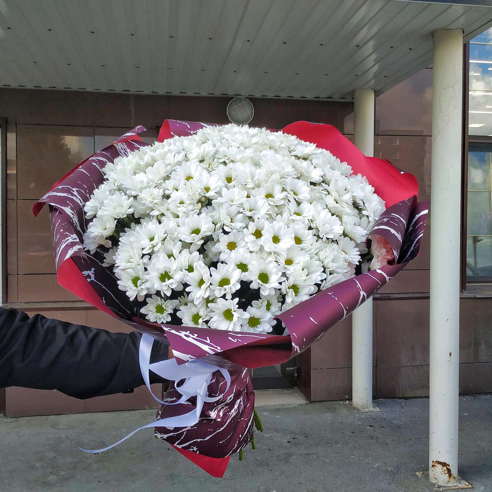 Шикарная охапка кустовых хризантем в благородном оформлении