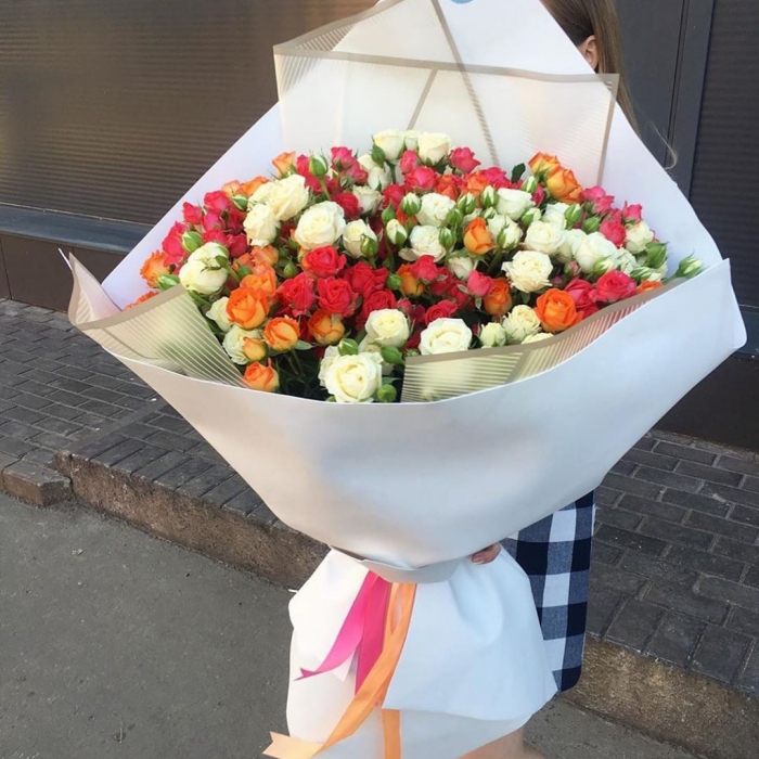 Букет состоит из 51 веточки кустовой разноцветной розы (предзаказ)