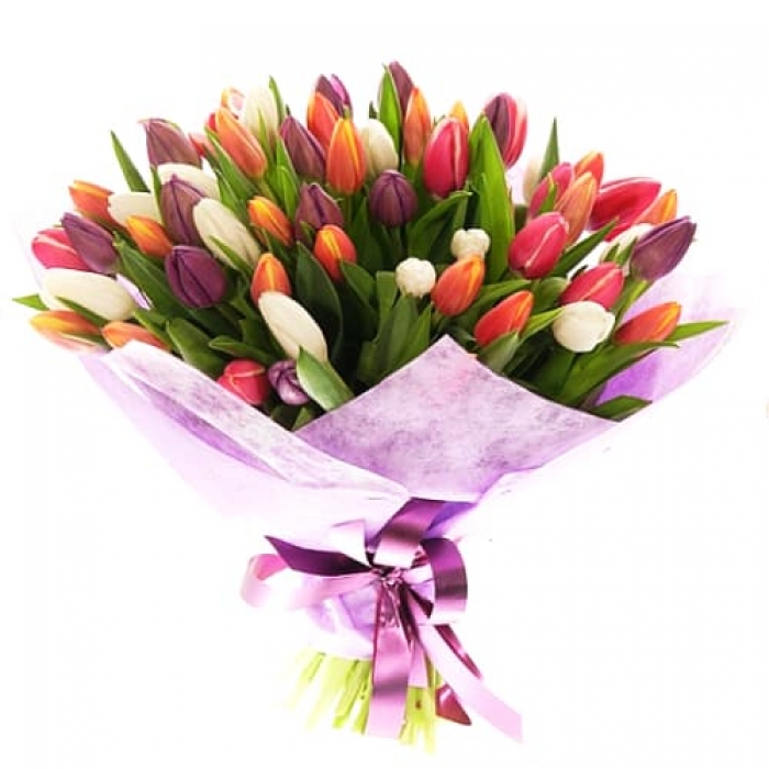 Яркий букет из 51 разноцветного тюльпана по супер цене!