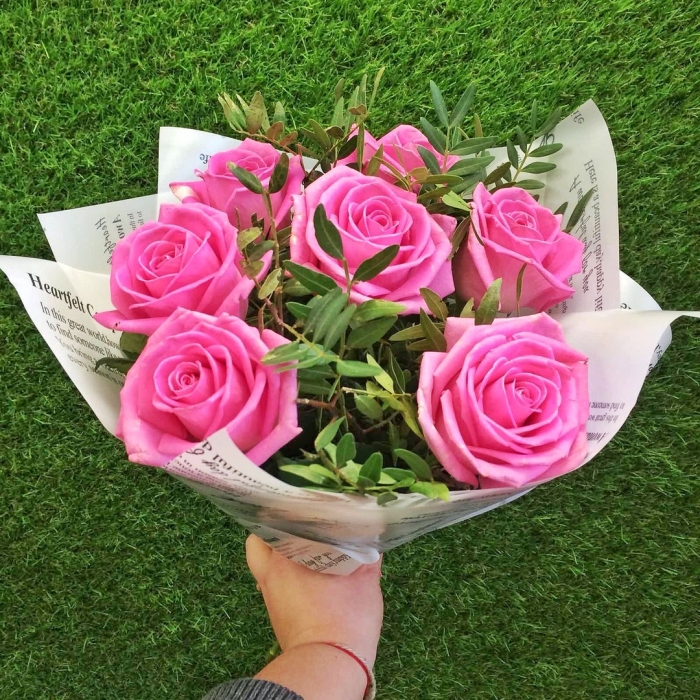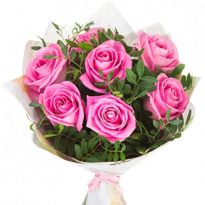 ГлавнаяБукетыБукеты из роз Букет из 7 розовых роз с зеленью