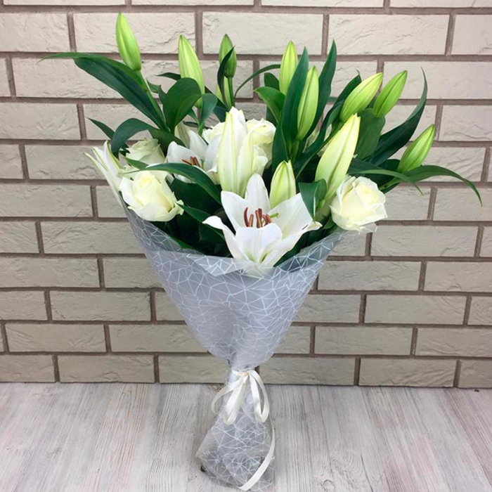 Букет состоит из 3х веточек лилии, 5 белых роз длиной 70 см. Оформление целлофан