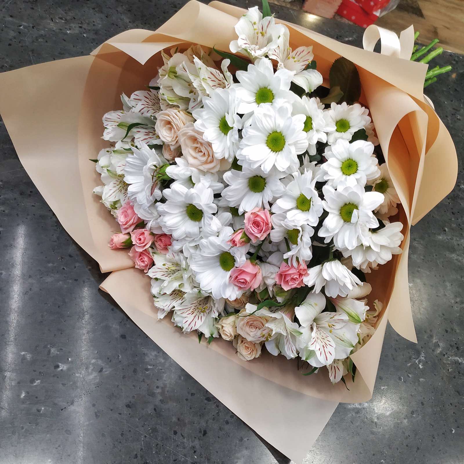 Состав: Кустовая роза 4 шт, Хризантемы ромашки 4 шт, Альстромерия 5 шт.