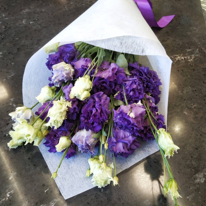 Букет оформляется из фиолетовых или с фиолетовой окантовкой эустом.