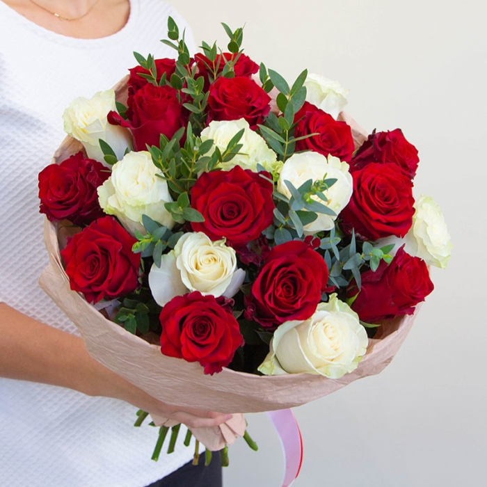 Букет из 21 розы 50 см в красно-белой гамме с добавлением зелени и в стильной упаковке