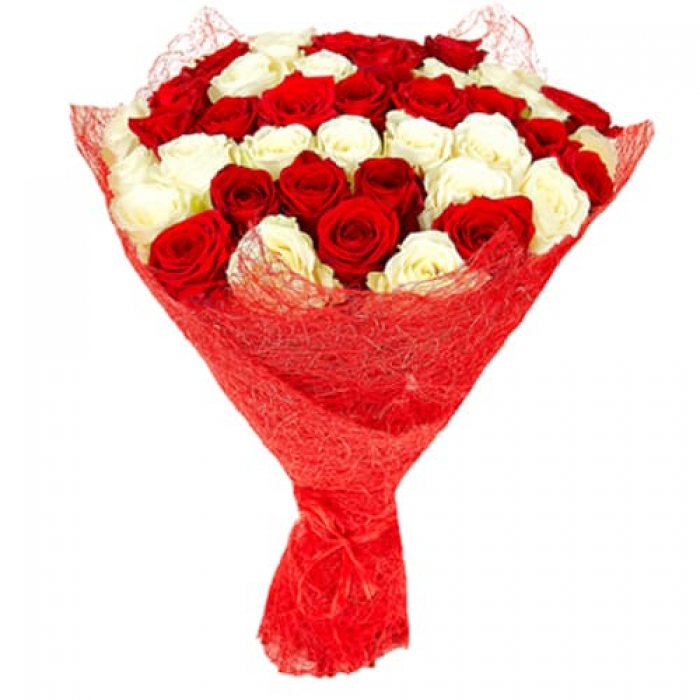 Контрастный букет из 35 белых и красных роз в красном оформлении.