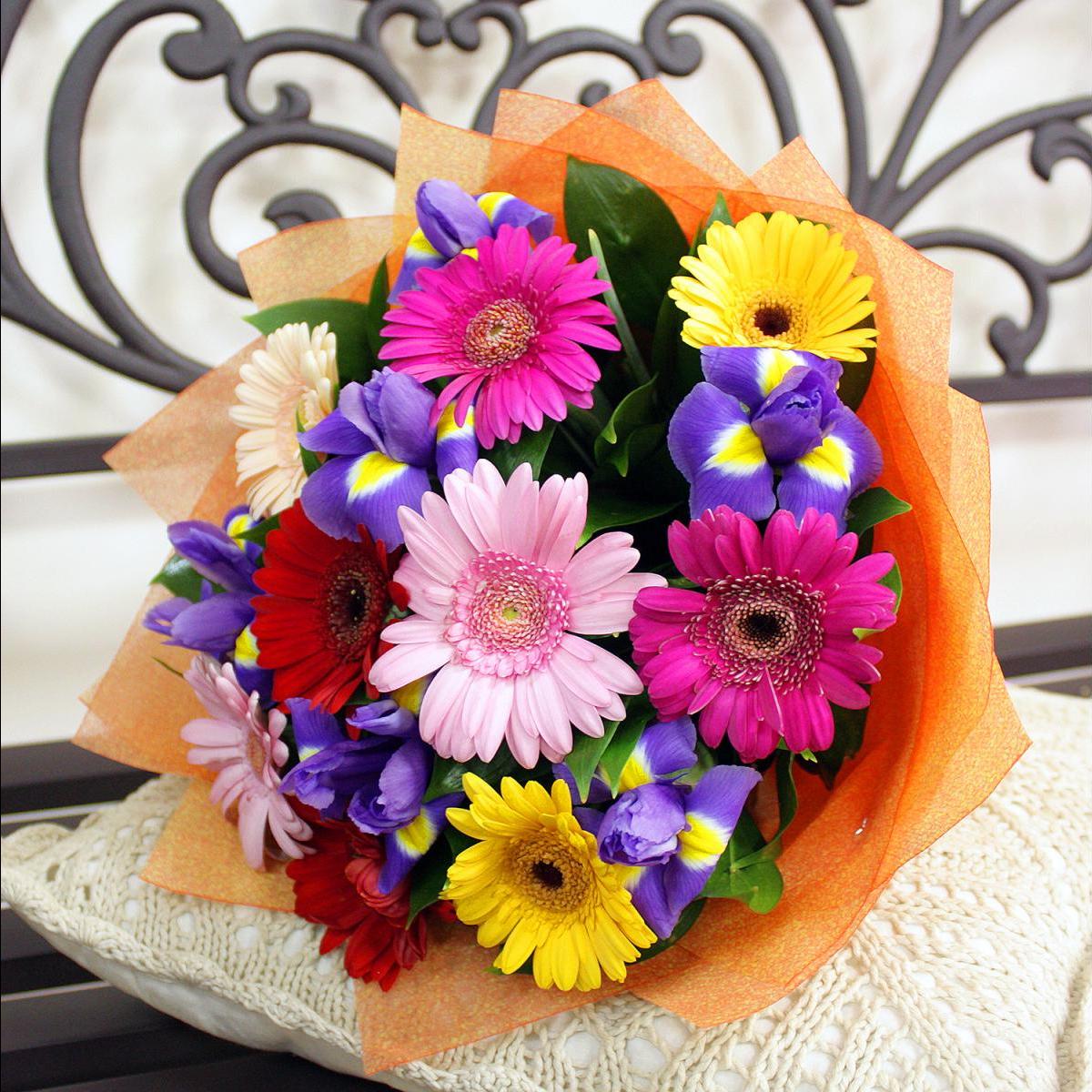 Состав: Букет из 9 гербер, 6 ирисов и зелени.