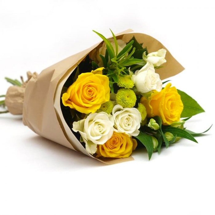 Сочетание трех желых роз с четыремя белыми и веточкой хризантемы ( зеленой или желтой) делает этот букет очень необычным.