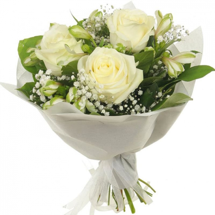 Милый букет из трех белых роз 50 см, 4 белых веток альстромерии и укашенный гипсофилой.