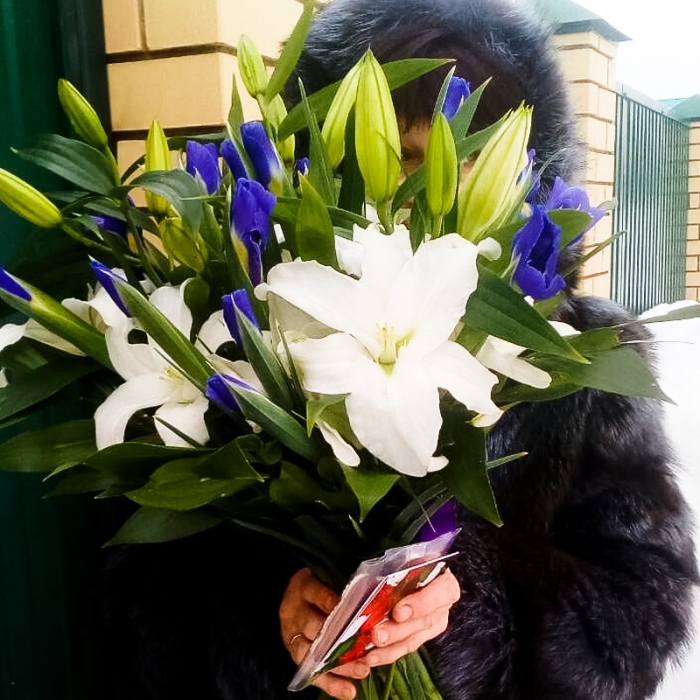 Очаровательный букет из 3 белых лилий, 15 синих ирисов, 5 веточек рускуса, украшенный атласной лентой.
