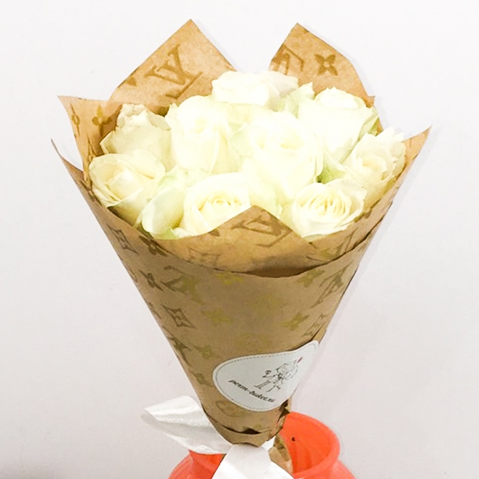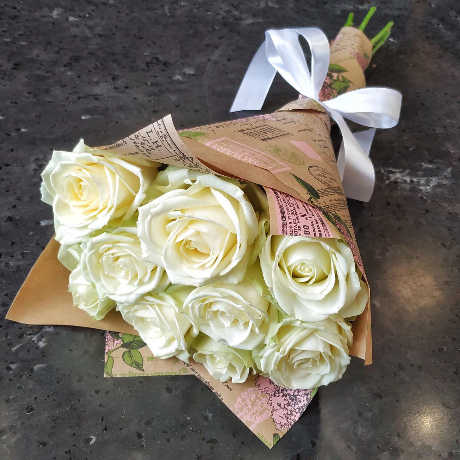 Букет «Утренняя роса» состоит из 9 белоснежных роз длиной 50 см