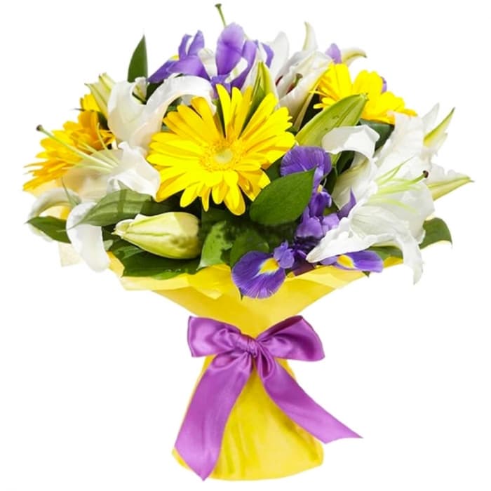 Пышный букет «Весеннее небо» станет желанным подарком на любой праздник. Состав букета: лилия, герберы 5 шт, ирисы 7 шт.