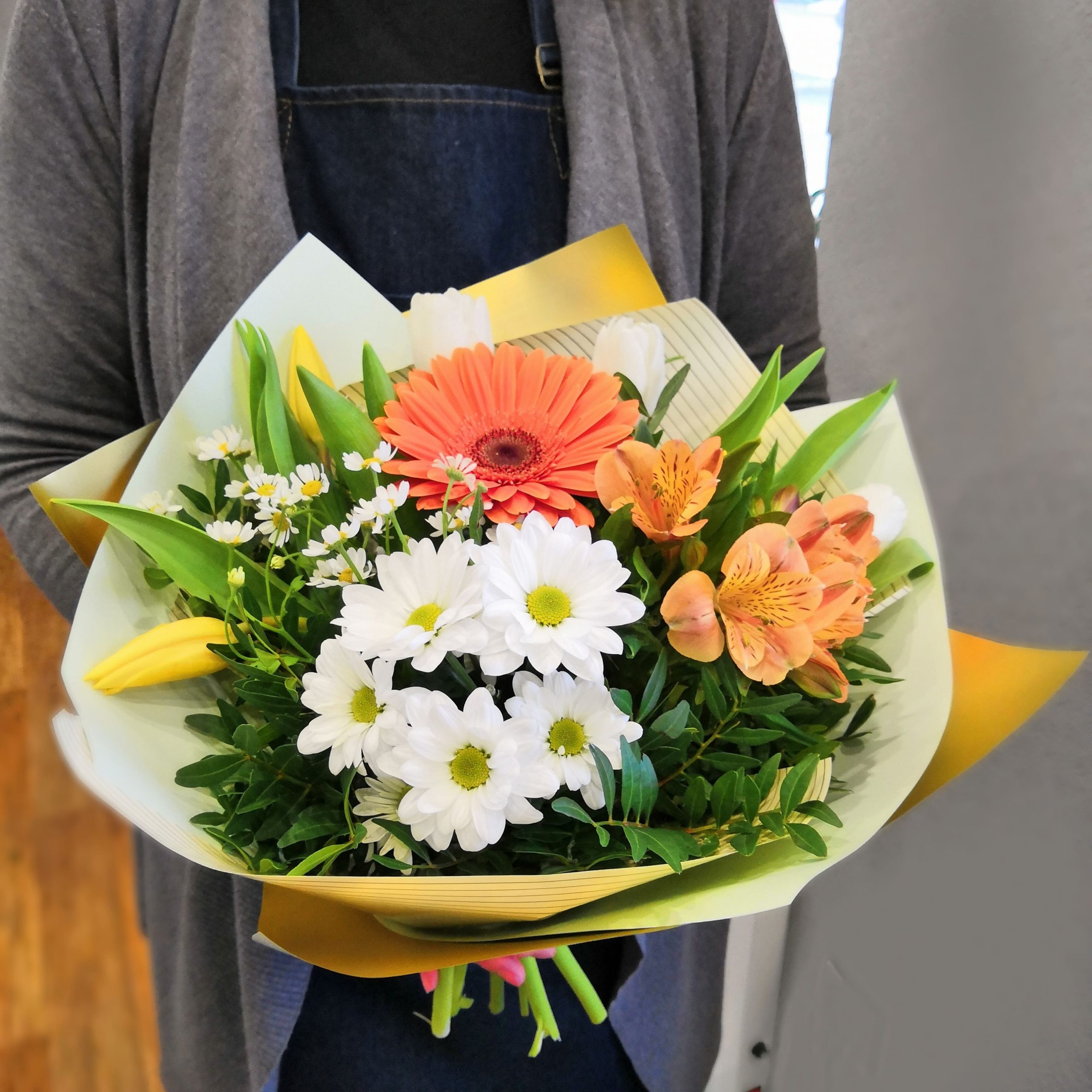 Приятный букет из герберы, 5 тюльпанов, хризантемы, веточки камилы и альстромерии с зеленью в оформлении