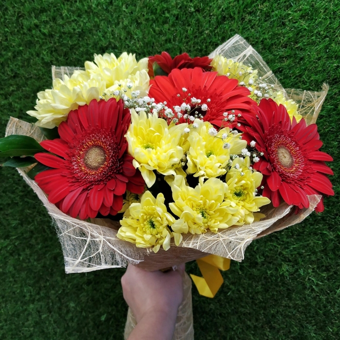 Букет Яркая жизнь состоит из 4 красных герберов и 3 кустовых хризантем ярко желтого цвета, вся композиция украшена белой гипсофилой.