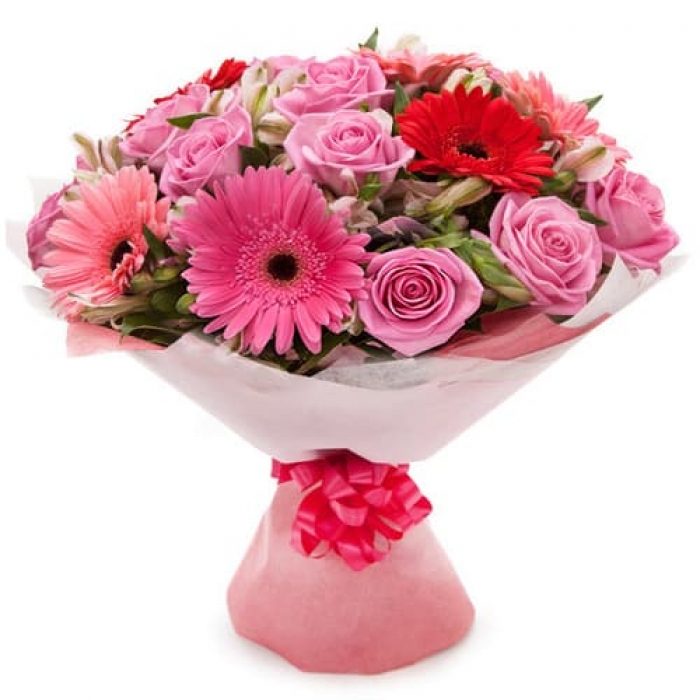 Яркий букет из 9 роз, 5 гербер и 5 альстромерий в розовых тонах:)