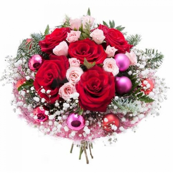 Состав: 5 красных роз Гран При, 7 розовых кустовых роз, гипсофила, папоротник, 15 новогодних шаров, оформление. Размер: 30x25x30 см