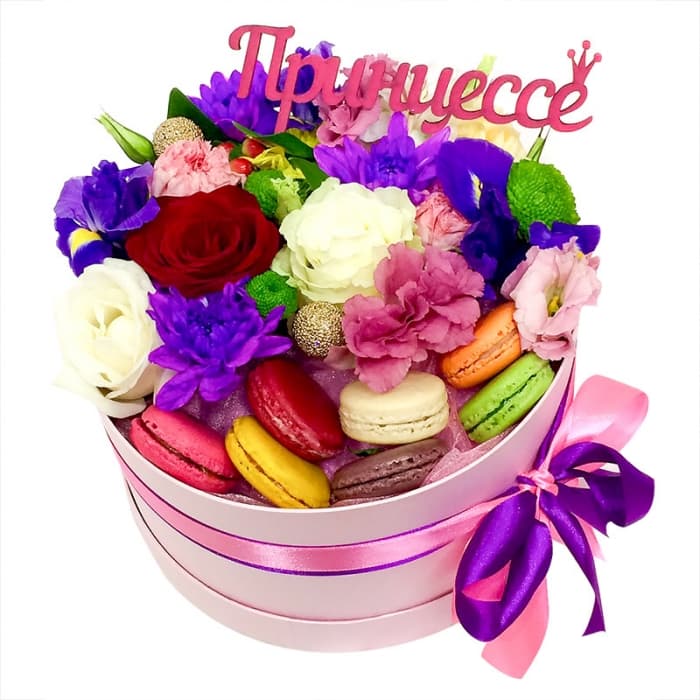 Яркая и необычная композиция из различных цветов с макарунами.
