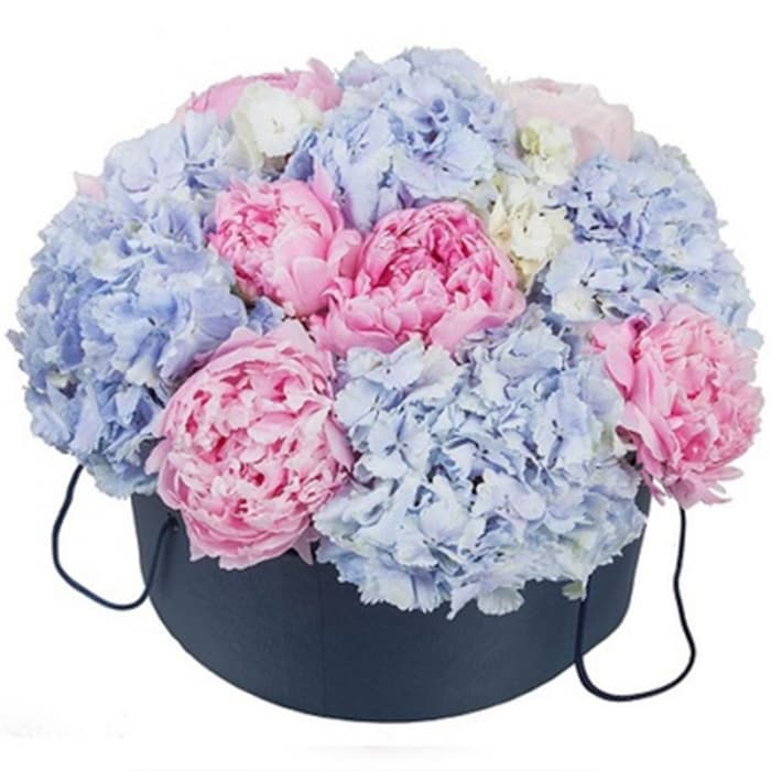 ГлавнаяЦветыГортензии Композиция из гортензий и пионов в шляпной коробочке (Предзаказ 1 неделя)