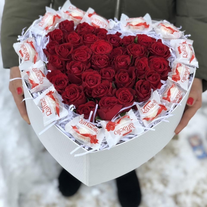 Композиция состоит из 33 красных роз и конфет Raffaello.