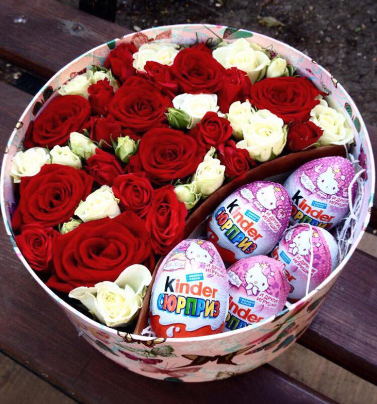Композиция в шляпной коробке из роз и киндеров.