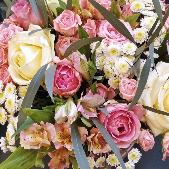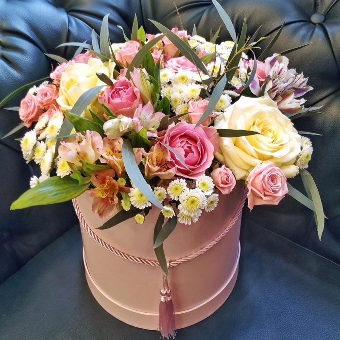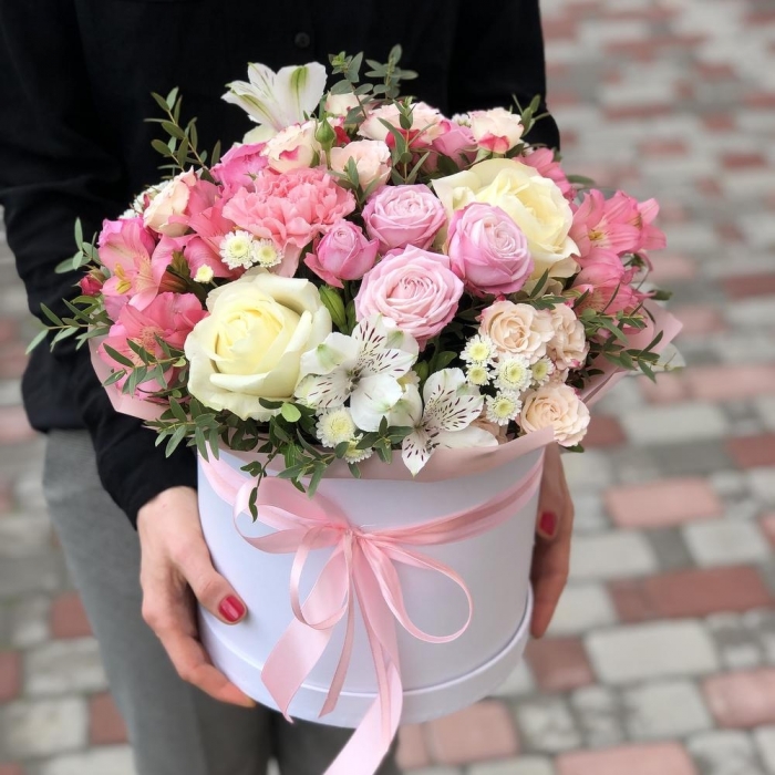 Состав композиции: 4 веточки разноцветной альстромерии, 3 веточки кустовой белой хризантемы, 3 белых розы, 5 веточек разноцветной кустовой розы, 3 розовых гвоздики, зелень. Оформление лента. Цвет коробки может отличаться от представленого варианта
