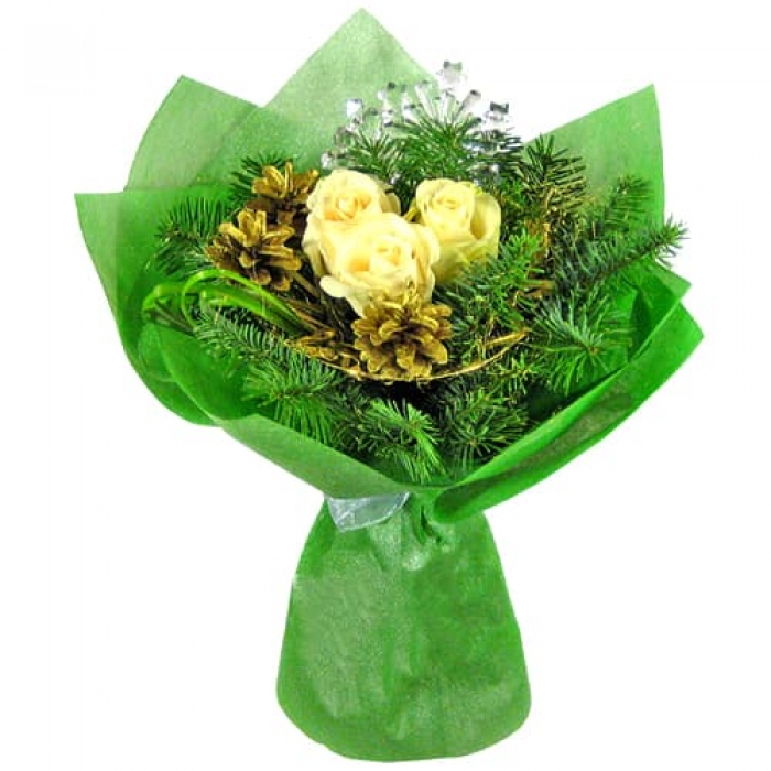 Состав: 3 желтых розы, еловые веточки, зимний декор, оформление.