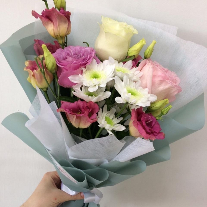 Букет состоит из 3 разноцветных роз Кения (длина 35-40 см), 1 веточки белой хризантемы, 1 веточки розовой эустомы. Оформление фетр