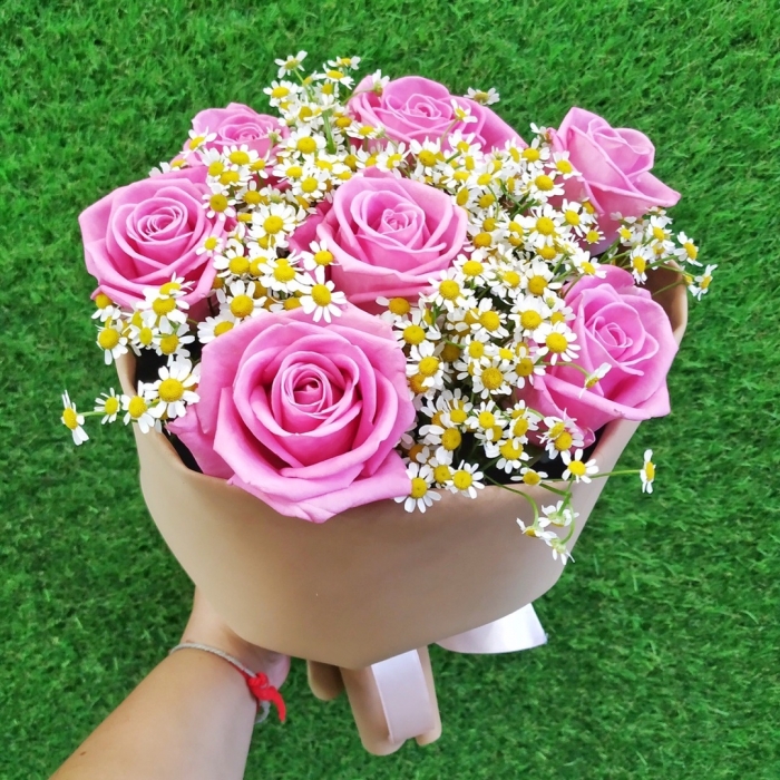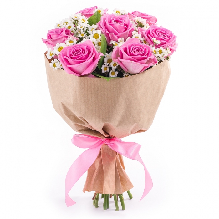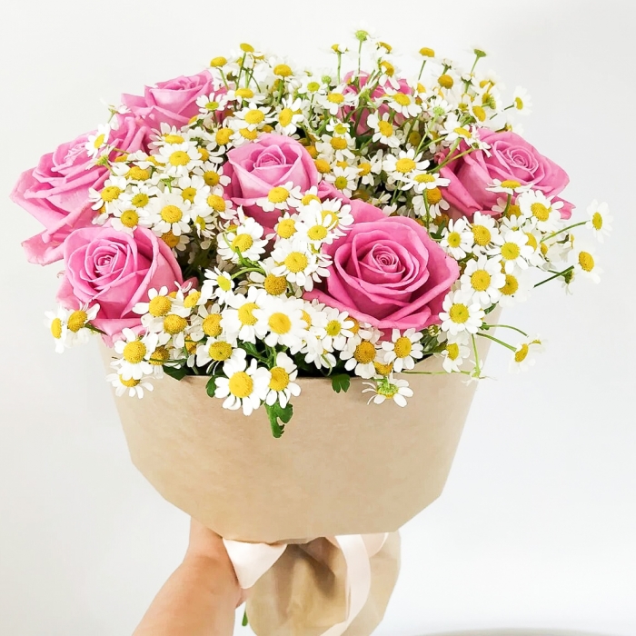 Нежный букет из сочетания розовых роз с милыми ромашками.