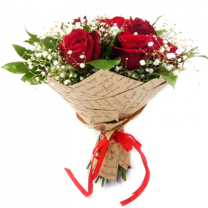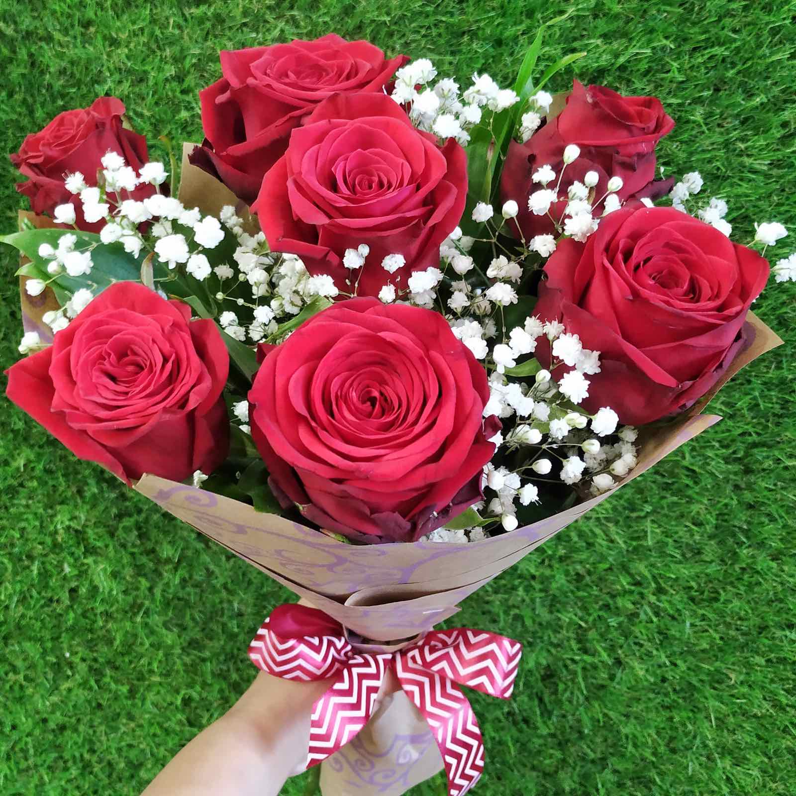 Гипсофила с красными розами смотрится, как снег на красном фоне. Классический букет из 7 красных роз высотой 50 см. Стильно, красиво и со вкусом.