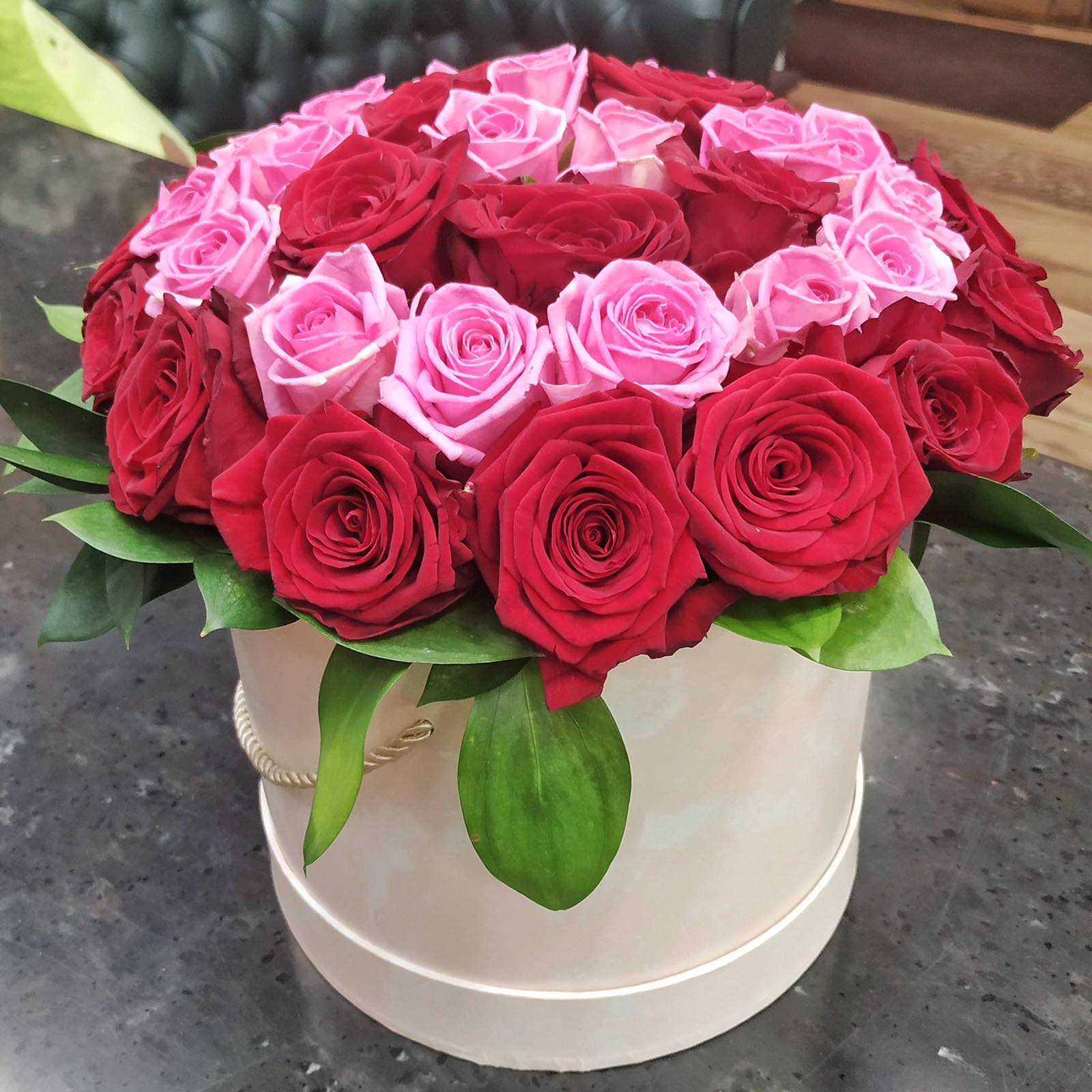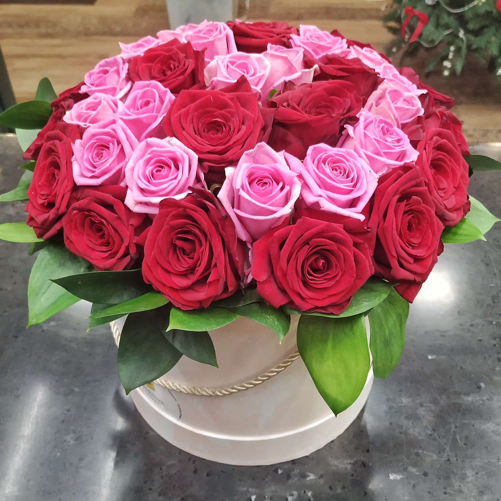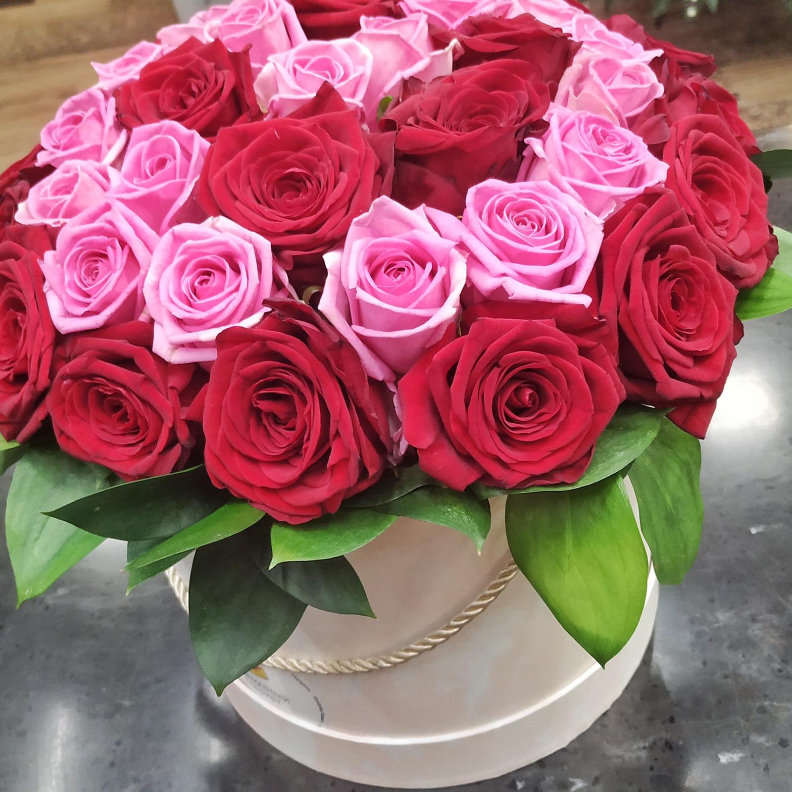 Шикарная шляпная коробка из 39 роз, красных и белых.
